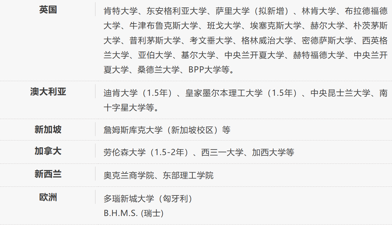 基本学制为 3+1 模式,国内学习二至三年完成规定的课程,可对接英、澳、加、新等国 50 多所大学继续深造,毕业获国外就读大学学士学位,国家承认其学历,回国享受留学生待遇,与国内本科学历同等地位,可考公、考编、考研等。