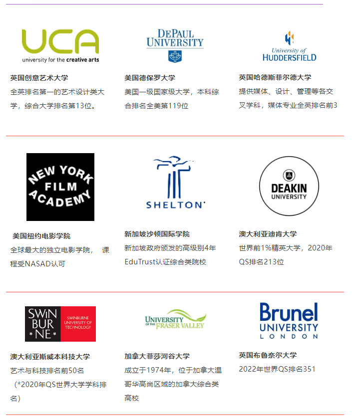 上海温哥华电影学院中外合作“2+2”国际影视本科项目创办于2017年,依托上海大学延长校区人文、影视学科及产业优势,以及上海温哥华电影学院中外合作办学优势,整合国内外教育资源和产业资源,全力打造全英语教学、实践特色鲜明、致力于培养学生对影视文娱专业的深刻理解和准确运用。项目合作高校遍及美国、英国、澳大利亚、加拿大等世界500强主流高校或艺术类顶级高校。